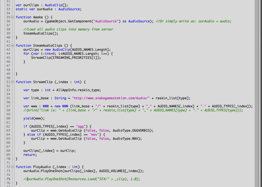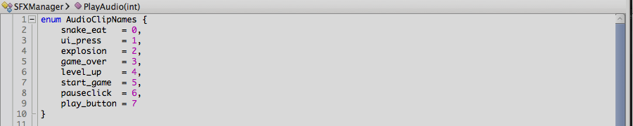 The streaming of the SFXs was slightly more complex, and the SFXManager.js script is slightly more brain teasing, yet very simple to manage. For any Composer/Sound Designer it’s a dream come true when sound design can be swapped and tested in real time. Which, for us, deploying and maintaining 6 Snake Games of various character yields for a strong pipeline. For a simple game like this, we organized the audio clips as enums. As they might change later, it will be useful to reference them by enum namerather than a non-contextual number in other scripts: