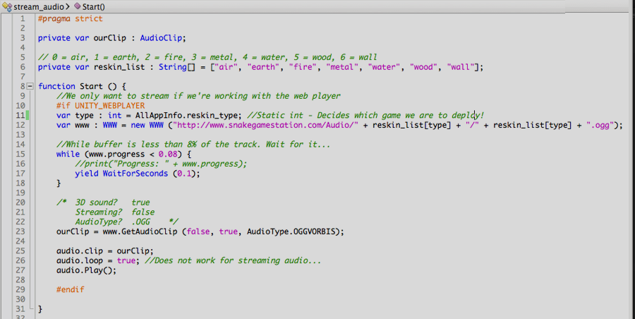 Working with audio in Unity can be a daunting task, especially when dealing with some of the lower level audio functions, or callbacks. However, we organized the audio mainly into two scripts. First, have a look at this stream audio JS file