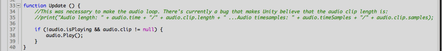 We kept all the audio volumes in the game constant at 1.0, so they could easily be mastered and adjusted in Pro Tools by Ben. It will most certainly result in a higher audio quality than adjusting the volume by the Unity built-in volume controller, thus ideal for any 2D game. The script creates an array of AudioClips, and stores them into memory once streamed, based on the prioritized order. This is the remainder of the script: